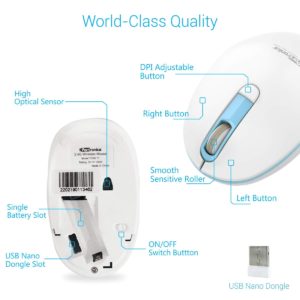 2.4GHz wireless technology can provide reliable connection within 360 degrees and 10 meters without any interference. The overall shape is full with 3D ergonomic design. It can effectively reduce the hand fatigue. Low energy consumption and low current design make the battery life longer, environment protection and energy saving. It brings an utmost comfort and a robust service. More than 3 million buttons lift is guaranteed. Due to world-class quality, high precision and performance; it makes interaction to the digital world unbelievably comfy. Easy to use no need any driver plugs and play directly.