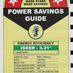 - Energy Rating: 5 Star. Best in class efficiency. Annual Energy Consumption: 1157.29 units. ISEER Value: 3.31 (Please refer energy label on product page or contact brand for more details)